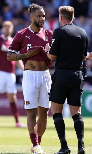 Tyler Roberts showing his abs to the ref
