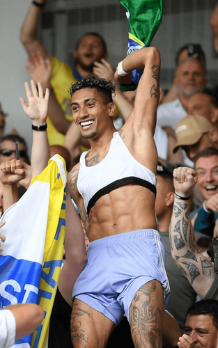 Raphinha shirtless and getting touched all over the place