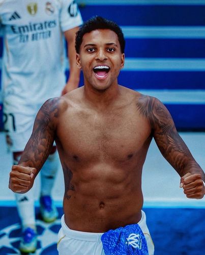 Rodrygo Goes celebrating without his shirt on